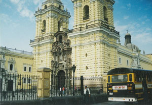 リマの教会。よく見ると建物の壁という壁に黒い鳥がびっしりとへばついています。