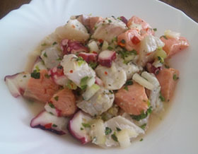 ペルーとメキシコでは国民食として愛されている魚介のマリネ、セビーチェ。たっぷり絞ったレモンが決め手です。