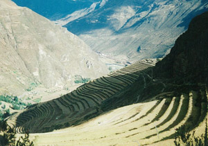 登るだけでも命がけのこんな山の上にまで緻密な段々畑や建物の跡が見えます。インカ帝国の凄みを感じさせられます。