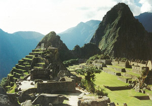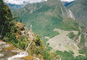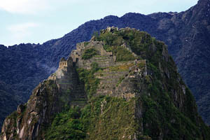 「マチュピチュ」は「老いた峰」、「ワイナピチュ」は「若い峰」という意味です。この山の頂まで登ってきました。よく見ると山頂付近に人工物が見えますね。下に拡大写真を載せています。