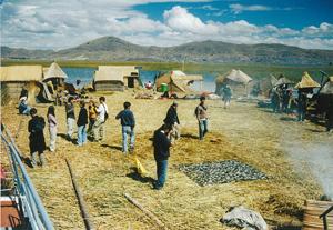 彼らは、陸に暮らす人々と交易をするなど交流はしながらも、湖上での生活を今もまだ続けています。湖の上で暮らすと言っても、先程も書いたように、トトラで作った浮島に同じくトトラで作った家を建てて暮らすという、ちょっと想像もつかない生活です。島の寿命は長くて15年ほどなので、何度も作り直していきます。家族や親族単位で島を作るそうですが、親族同士がケンカすると島を切り離したり、結婚して親戚になると島を繋げたり、という非常にユニークな風習を持っています。その様子を想像すると(不謹慎ですが)ちょっと笑ってしまいます。住居だけでなく移動に使う船もトトラ、島民が普段利用する学校や病院のような公共施設もトトラを使って湖上に作られています。あらゆるものが再生可能な草で出来ているのです。まるで映画の世界にでも迷い込んだようなその様子は、感動的ですらあります。なお、僕が訪れた2002年頃はなかったと思うのですが、最近は観光客向けに、トトラで作られたカフェやレストラン、ホテルなどもあるそうです。電話ボックスまでトトラを編んで作られているという徹底ぶりには舌を巻きました(もちろん電話は普通の電話です)。しかし考えようによっては、豊穣な湖の幸と湖畔や湖上に生えるトトラ、そして陸の民から魚と交換で得る野菜だけで全てが完結する彼らの暮らしは、ほぼ完璧な「持続可能な生活」とも言えます。