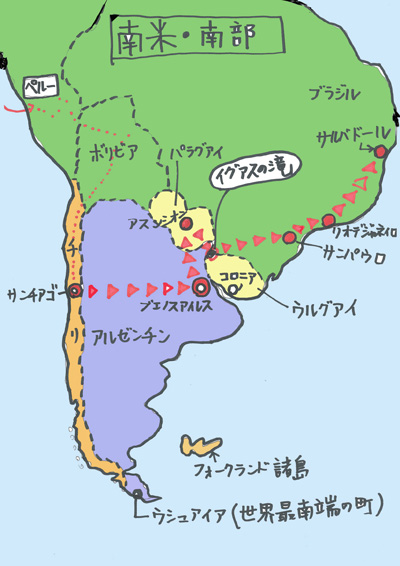 このあと、アルゼンチンとブラジルの国境でイグアスの滝という超巨大瀑布を見ておしっこをちびりそうになったり、パラグアイで地図に載っていない移民の集落を通り抜けたり、サンパウロの東洋人街で日本食を食べまくったり、ブラジルで一番陽気な街と言われるサルバドールで現役のヒッピーに会いに行ったり、まあ、ここで書きたいようなネタ満載で旅が続いたのですが、残念ながらこの旅行記を書く物理的な時間が無くなってしまいました。ですので、とりあえず南米を出てからの旅の軌跡を少したどってみましょう。