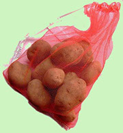 ジャガイモや玉ネギ,みかんなどを入れている赤いネットです。中の野菜くずや生産者カードを取り除き、くくらずにそのままお返しください。