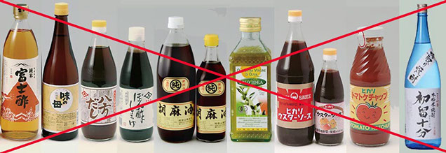 油やソース類のビンなど、また味の母や米酢などの小ビンも回収不可です。