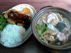 名物のランチの値段を見てビックリ!これじゃあの35年前の西荻窪より安いじゃありませんか!鶏肉スライスを丁寧に叩いて薄く伸ばし、カリカリに揚げたカツとご飯、そして目玉焼きに千切りキャベツ。うまい!粗悪な冷凍カツが多いこの業界ですが、、ここのは全て手作り、あ~幸せな気分。隣りの学生さんのマネをして、鍋やきうどんを追加してみれば、ぐだぐだしていた我が学生のころにタイムスリップしていくではありませんか。ここはどこ?私はだれ?