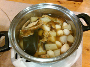 この時期お残しゴロゴロはやとうり。ぬか床ないし、細かく削ってなますやタイのソムタムもどきも体冷やすし。じゃ、温かいレシピは?とテキトーにしたのがこれ。まず出汁取り。煮干、アジ煮干、刻み干し椎茸、干しえのき、根昆布。この日はストーブの上で半日放置プレーしたおかげでめっちゃ濃厚な出汁に。酒、みりん、塩で調味。醤油は香りづけ程度に。厚く皮むきし、テキトーにカットしたはやとうりと、この日は干からびつつある里芋のチビも入れてさらにストーブに放置、景気づけに揚げ竹輪などいれて食すれば、あれ、あのはやとうりも冬瓜のようなそうでないような。