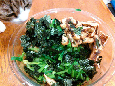 ヨメが御母堂さまとハノイへフォー食いに行ったので莫大に菜っ葉お残し。小松菜2束、ホウレン草2束、水菜、菊菜。これを全ておひたしにし、絞りながら切ってボールに全部入れる。焼き揚げと焼き海苔をちぎっていれ、めんつゆで合えます。これがうまいんだ。