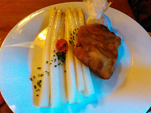 5月のドイツは一番気持ちの良い季節。透明感あふれる空気の中、澄み渡る青空が何日も続きます。最高気温は26℃以上になることも多く、日本とあまり変わりません。が、最低気温は6℃くらいなので、夏と冬の恰好を用意しなければなりません。この季節、日本では筍とか初鰹とか、旬のものがあるように、ドイツの道端ではシュパーゲルの露店が並び、レストランでも特別メニューがあります。よーするに白いアスパラなのですが、緑のアスパラだったらまだしも、日本人には缶詰のイメージしかない白いアスパラに、ドイツ人は5月の季節感を感じるのだからあら、不思議。さてそのお味は?う~ん、缶詰とあまり変わらないかな~。写真の隣はシュニッツエル。本式では仔牛のカツレツなのですが、豚肉で代用することも多く、揚げ具合も、日本のトンカツ屋さんで修業してきな!レベルのものが多いのですが、この店のものはまともでした。