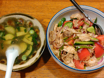 まず、湯を沸かし、酒、塩糀などを投入、これでTONTONの豚バラスライスをテキトーに切って茹で、水にさらす。茹で汁はすばらしいスープになっているので、再び味を見て、生姜、ねぎ、塩、ナンプラーなどで最終味付け。具はワンタンとか餃子入れるのも好きだけど、この日はシンプルにズッキーニだけにしました。サラダのほうは、赤玉ネギスライスに油2:酢1、塩コショウしてよく味を引き出してから、トマト、キュウリの乱切りをぶち込み、さっきの茹で豚とごちゃごちゃに混ぜ混ぜ。この日は莫大の容積となりましたが、ぺろりと食い尽くしたのでした。