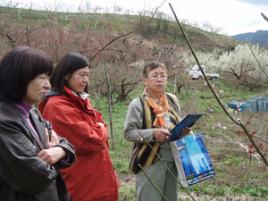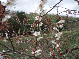 | @今回は専従の上原と消費者会員が3人同行。今年に出荷される梅の畑をチェックして回りました。 | A4月とはいえ、吉野の里はまだ眠っているよう。梅の花が咲いていました。 | |