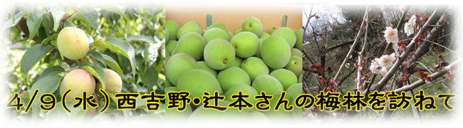 去る4月9日、取り扱い品検討委員の皆さん(3名)と奈良県五條市西吉野の辻本定さんの梅畑を見てきました。ちょうど梅の花が終わり、小さな実をつけ始めているところで、今年の梅の出来具合と今年の注文企画の確認をしてきました。 |