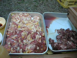 | @土曜日の夕方から、生産者の旧家に集まって、平飼い鶏舎で昨日まで走っていた鶏でバーベキュー | A生産者の皆さんが解体してくれたニワトリさんのお肉。モモ、キモ、レバー、ササミ…。 | |