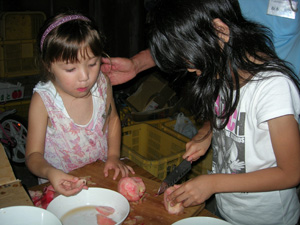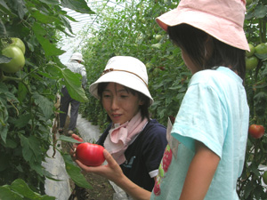 2日間とも少し行き過ぎなぐらい素晴らしい天気に恵まれ、むしろ熱中症などの心配をしなければいけないくらいでした。が、園部の生産者の方々の段取りが非常に良かったのと、参加していただいた消費者の方々の積極的な協力に助けられまして、無事に終えることができました。この場を借りてお礼を申し上げます。 結婚前から行きたかったトマトまつり!でもひとりでは気後れして参加できずにおりました。今回3歳の息子と6歳の娘についてきてもらい?ようやく10年間の思いを果たすことができました。現地では8年前にグループ購入でお世話になっていた方と嬉しい再会。お孫さんとご家族と毎年このトマトまつりに参加されていることをお聞きしました。他にもリピーターの方がとても多く、生産者の皆さんとご一緒にテキパキと楽しんで準備や片付けをされているのがとても印象に残りました。 |