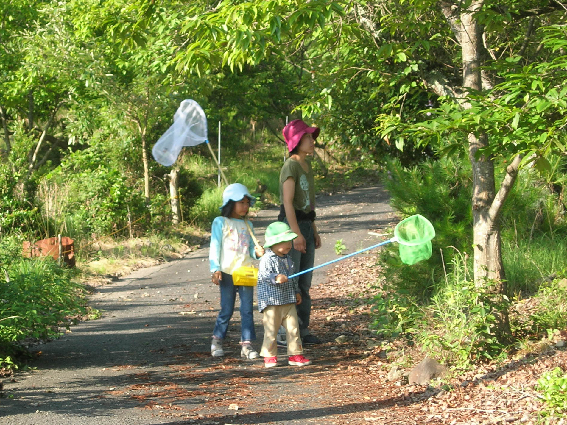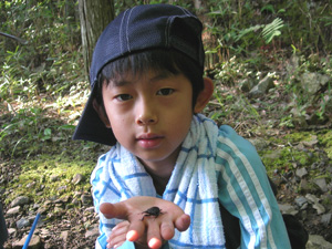 | D翌朝は早朝から起きれた人たちだけで、近くの山林で虫取りです。ちゃんと見つかったでしょうか? | Eそれなりに戦果はあったようですね。年々大きい虫は減ってるけど小型のクワガタをゲット! | |