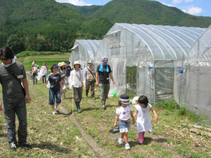 | B今回、生産者のお宅に分宿させていただいた参加者の皆さんです。若い方の参加が増えてます。 | C子供たちだって自分で働きます。おうちでもお手伝いしているのでしょうね。 | |
