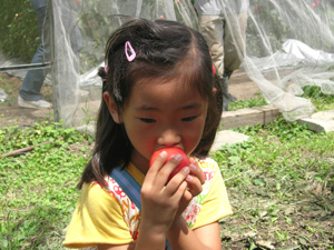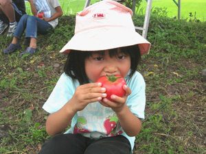 | H採ってきたトマトをそのままガブリ! | Iこの子は、日頃はなかなかトマトを食べてくれないのですが、今日は半分食べることができました。 | |