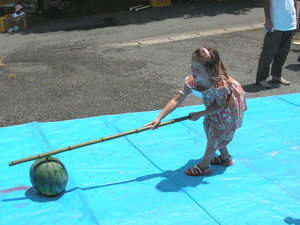 | J昼食は竹を割って流しそうめんです。もたもたしているとドンドン下流まで流れていってしまいます。 | Kデザートにするべく、午後はスイカ割りにチャレンジです。竹ざおではなかなか割れませんでしたが…。 | |