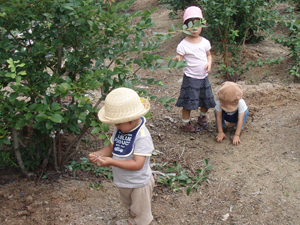 翌日はおたのしみ・ブルーベリー狩りへ。 摘みたてをほおばると、少しすっぱいブルーベリーが口の中にひろがり、とまらなくなります。 口の周りを紫に染めているこどももチラホラ。 |