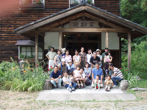 | 宿「塩湯荘」でお泊り。山の中なのに塩の温泉が出るということで、旅の疲れもとれゆったりしたあと、豪華な山の幸をいただきながらの夕食交流会となりました。 画面右端が「まぁの」の小村さんです |